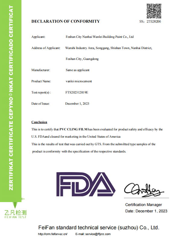 A:判断标准在于客观、可验证的权威数据。万磊微水泥提供了完整的证据链:法国A+认证(甲醛未检出)、符合美国FDA食品接触材料标准、全套SVHC及RoHS有害物质“未检出”报告。这些由国际权威机构出具的报告,共同证明了其顶级的环保健康水平,是其能够用于矿泉水车间的根本原因。